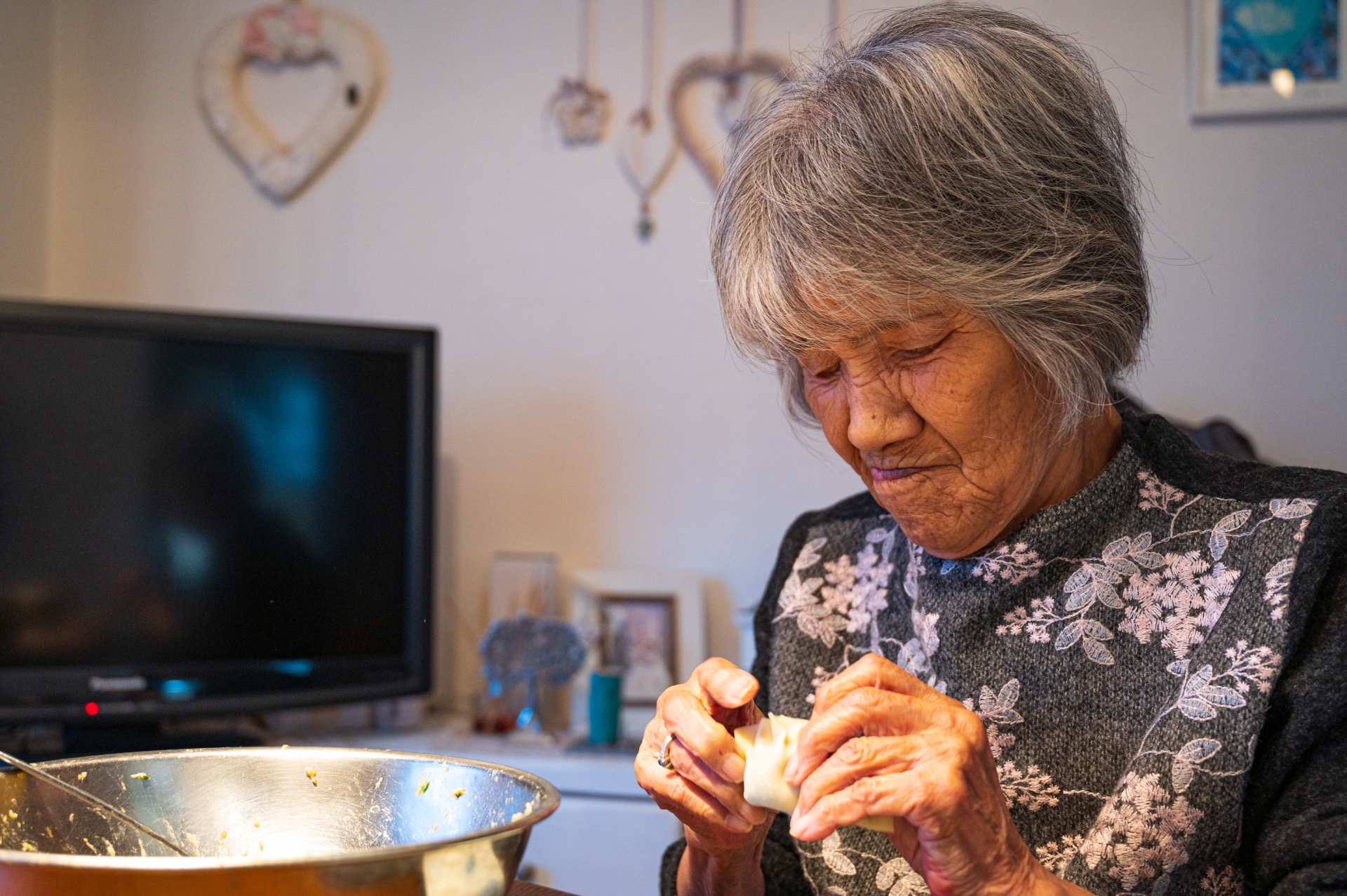おばあちゃんが一つ一つ手包みしている餃子。